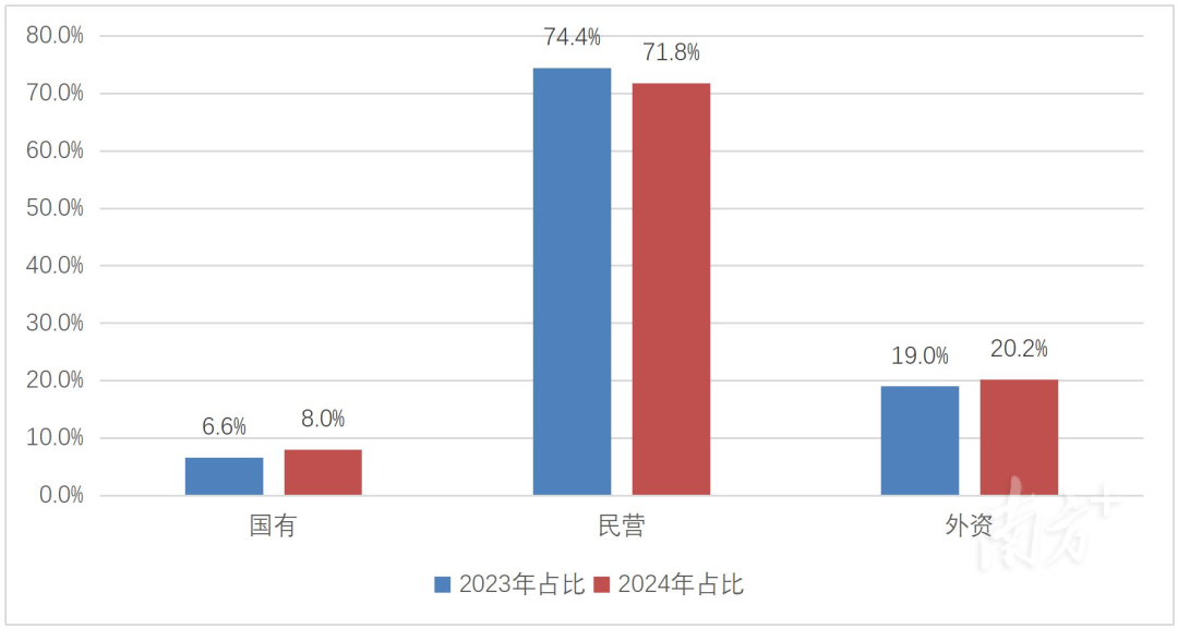从500强企业的所有制类型看,民营企业数量有359家,占比达71.8%,依然拥有数量优势。国有、外资企业数量占比分别为8%、20.2%,但相比去年,数量占比均有所提升。