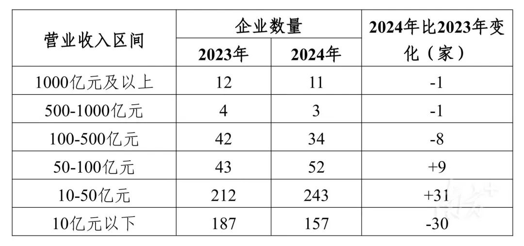 从营业收入规模区间来看,100亿—500亿元、500亿—1000亿元、1000亿元及以上的头部企业数量均同比减少;营业收入50亿元以下的企业有400家,占总数的80%,呈现二八分布结构。