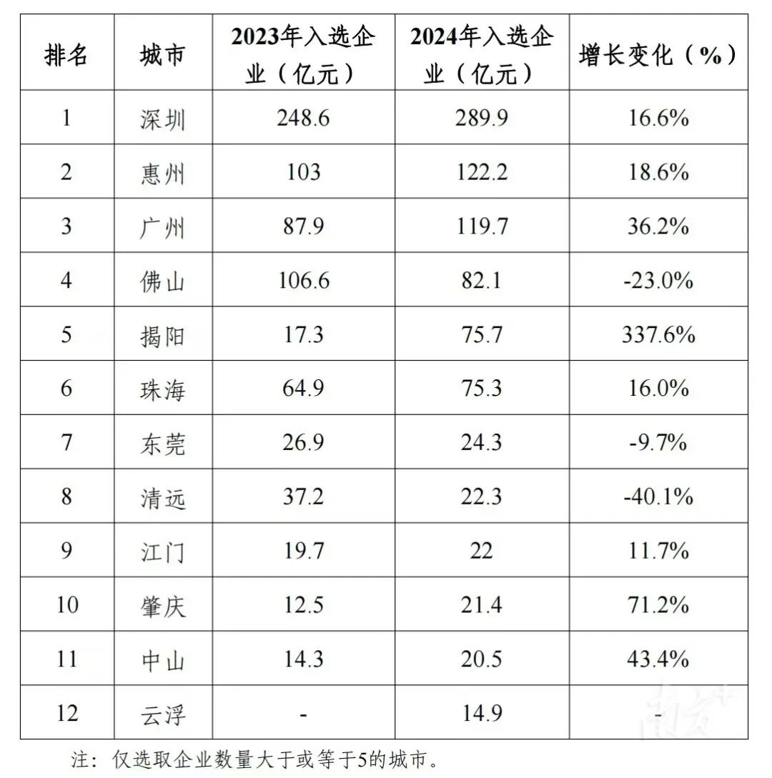 紧随其后的是惠州、揭阳、中山等第二梯队城市,入选企业数量分别为22家、17家、16家;位居第三梯队的是肇庆、清远、云浮,入选企业数量分别为9家、8家、8家。此外,汕头、汕尾、梅州、阳江、韶关,入选企业数量分别是3家、2家、2家、2家、1家。