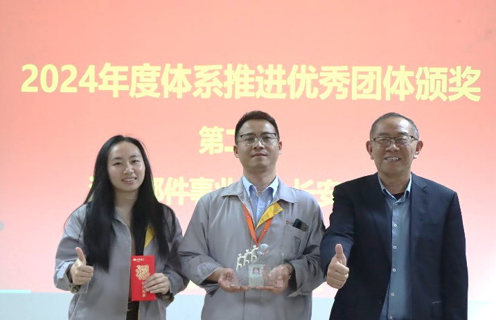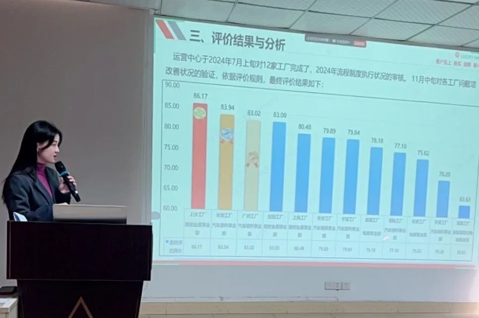 在表彰前,公司运营中心就2024 年公司各工厂管理体系执行力状况及评价结果进行汇报了。报告表明,相较于2023 年,各工厂整体执行率和改善率显著提升,但仍有部分标准模块需重点关注、严格控制并加强改善。公司管理体系依靠领导作用、全员参与等七大质量管理原则,按 PDCA 原则持续推进。针对现存问题,2025年确定三项重要工作作为聚焦改善方向:一是精简流程;二是加强流程执行监控;三是增强体系管理意识。