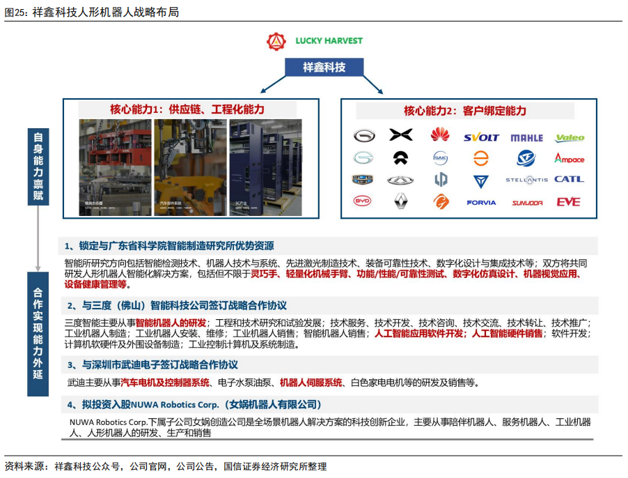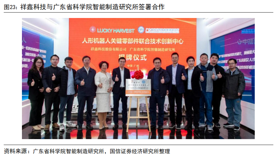 25年1月,祥鑫科技与广东省科学院智能制造研究所签署《合作协议书》,双方共建人形机器人关键零部件联合技术创新中心,研究院为公司提供在人形机器人关键零部件等产品开发领域的技术研究服务和支持,共同研发人形机器人智能化解决方案,包括但不限于灵巧手、轻量化机械手臂、功能/性能/可靠性测试、数字化仿真设计、机器视觉应用、设备健康管理等。