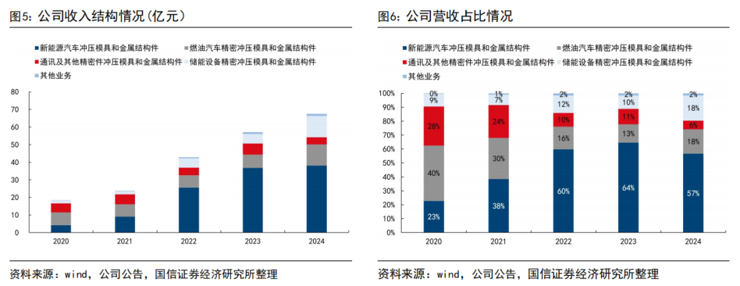 公司成立于2004年,是国内精密冲压模具和金属结构件领域领军企业,按照其产品场景分类其收入结构为:新能源车占比57%,储能设备业务占比18%,燃油车占比18%,通信业务占比6%;2024年祥鑫科技营收67亿元,同比+18.3%,归母净利润3.6亿元,同比-11.6%;近年来公司持续加码新兴领域,推动低空经济与人形机器人业务成为第二增长曲线。