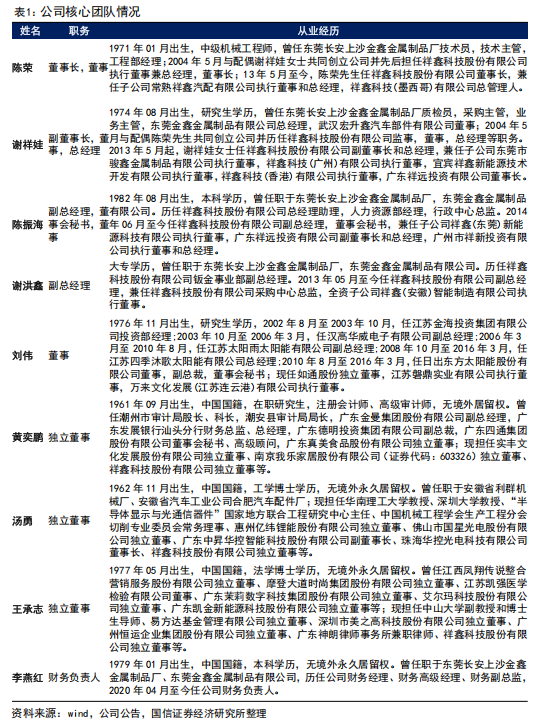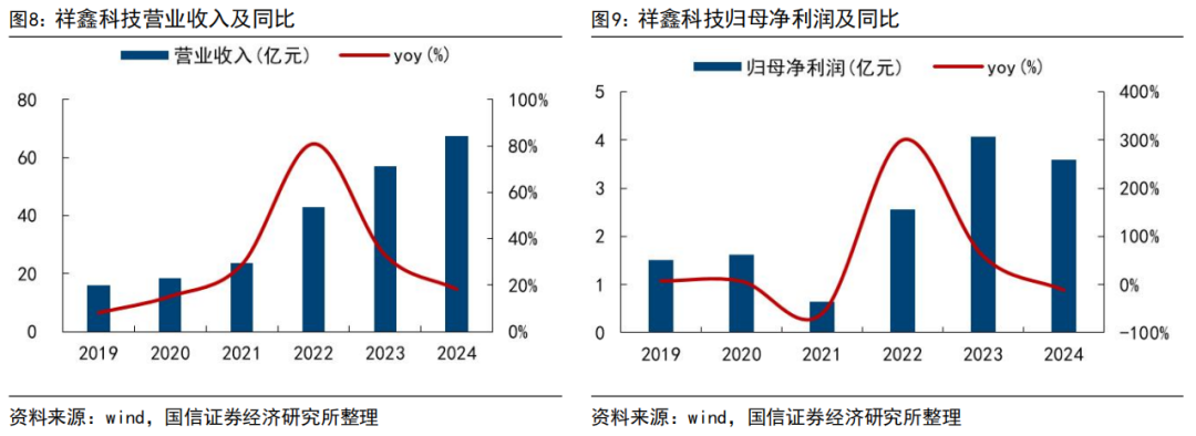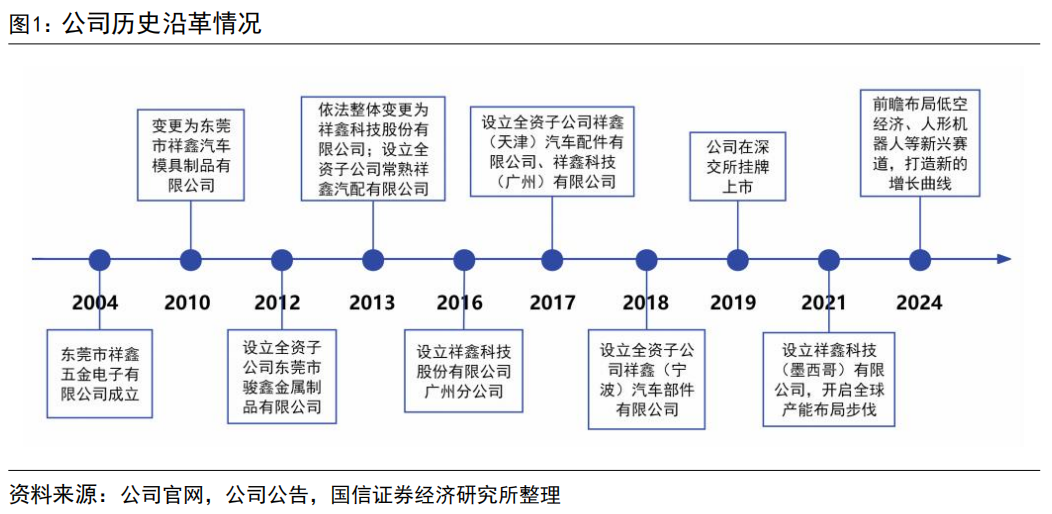 深耕模具及金属结构件领域,内生发展与战略转型双轮驱动成长。公司成立于2004年,前身为东莞市祥鑫五金电子有限公司,主要从事打印机、复印机等五金件加工业务;2008年正式进军汽车冲压模具及金属结构件领域,2013年完成股份制改造更名为“祥鑫科技股份有限公司”,2019年上市,2018年起布局新能源汽车、储能及光伏结构件业务,2021年设立墨西哥子公司,开启全球化产能布局;近年来公司持续加码新兴领域,2025年与广东省科学院共建“人形机器人关键零部件联合创新中心”,推动低空经济与人形机器人业务成为第二增长曲线,2024年公司营收67亿元,同比+18.3%,归母净利润3.6亿元,同比-11.6%。