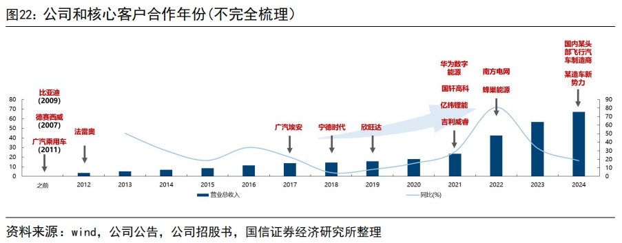 客户绑定能力强。公司2016年前五大客户结构为广汽集团(占比10%)、华为(占比10%)、佛吉亚(占比7%)、中兴(占比5%)、马勒(占比5%);2020年上半年公司前五大客户结构为华为(占比23%)、佛吉亚(占比10%)、中兴(占比7%)、广汽(占比5%)、马勒(占比4%),以及已定点但当时尚未量产的大额定点项目客户包括宁德时代、吉利汽车等,均为当时的行业领先玩家。近些年公司生产的产品得到客户的高度认可并建立长期稳定的合作关系,包括广汽集团、广汽埃安、吉利汽车、上汽集团、比亚迪、小鹏汽车、蔚来汽车、奇瑞汽车、零跑汽车、Stellantis、华为、宁德时代、亿纬锂能、国轩高科、欣旺达、Enphase Energy、蜂巢能源、本特勒、佛吉亚、法雷奥、马勒、延锋、Stellantis、雷诺等,涵盖汽车、储能光伏、通信设备等行业,可见公司具备绑定核心大客户的优秀能力和基因。目前公司部分客户已涉足机器人业务,后续有望扩大合作深度和合作范围。