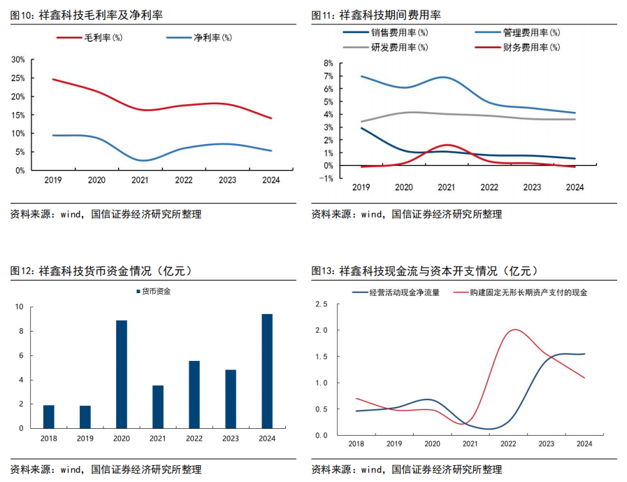 营收和利润常年维持稳定增长。依托于优质的模具和结构件的制造能力,祥鑫科技营收从2014年的7.3亿元增长到2024年的67.4亿元,复合增速为26.4%,利润从2014年的0.71亿元增长到2024年的3.59亿元,复合增速为17.7%,实现多年的业绩稳定增长。2024年营收67亿元,同比+18%,规模实现稳定增长,归母净利润3.6亿元,同比-12%,系原材料成本上行及行业竞争加剧导致。
