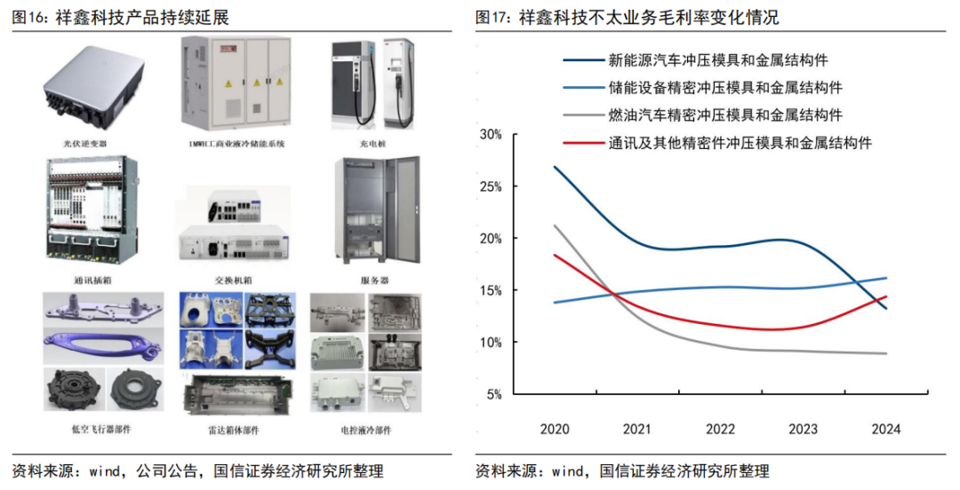 产品层面,祥鑫科技产品布局以1)新能源汽车冲压模具和金属结构件为核心业务,2024年营收占比57%,收入同比+4%,涵盖动力电池箱体、热管理系统等高附加值产品;2)储能设备业务快速增长,2024年占比18%,收入同比+123%,主要为光伏逆变器及储能结构件;3)传统燃油汽车精密件及通信设备结构件占比逐年下降,2024年占比18%,收入同比+57%;4)通信业务占比6%,收入同比-34%。