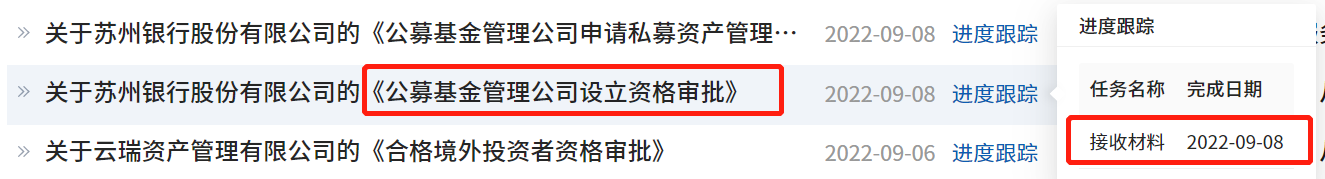 中国证监会官网信息披露,2022年9月8日,苏州银行拟设立公募基金管理公司并申请私募资产管理业务申请材料已获证监会接收。