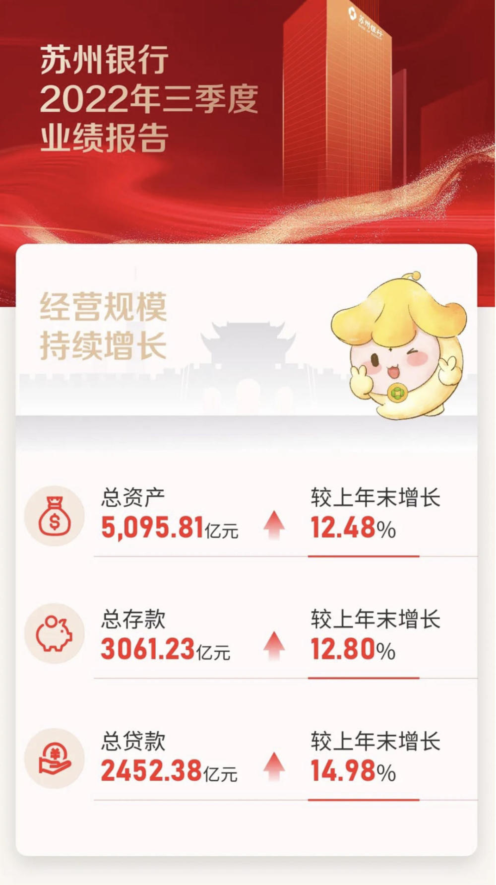整体来看,苏州银行交出了一份不错的答卷,盈利能力稳步提升。报告显示,今年前三季度,苏州银行实现营业收入90.25亿元,同比增长11.49%;实现归属于上市公司股东的净利润31亿元,同比增长25.92%。其中,第三季度营业收入、净利润分别为30.71亿元、9.23亿元,分别同比增长18.85%、27.93%。