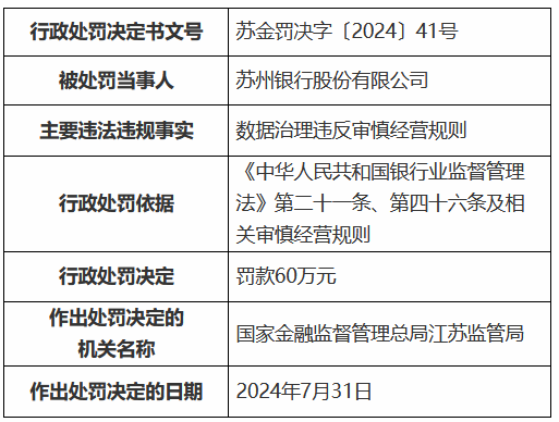 8月2日金融一线消息,国家金融监督管理总局江苏监管局行政处罚信息公开表显示,苏州银行股份有限公司因数据治理违反审慎经营规则,被罚款60万元。