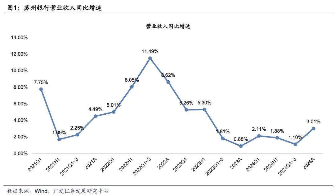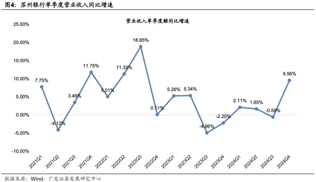 苏州银行披露2024年度业绩快报,24A营收增速大幅提升。24A营收同比增长3.0%,增速较23A/24Q1-3分别上升2.1PCT、1.9PCT;归母净利润同比增长10.2%,增速较23A/24Q1-3分别下降7.3PCT、0.9PCT;24Q4单季度营收、归母净利润同比分别增长9.6%、6.0%,增速较24Q3分别变动了+10.1PCT、-2.8PCT。我们认为24Q4单季度营收高增预计由于长债利率大幅下行,债券投资收益和浮盈皆可观,公司可能兑现了部分债市浮盈,其他非息对业绩贡献较大。