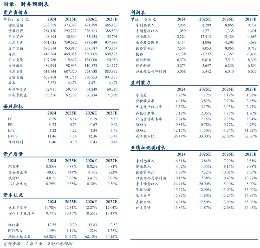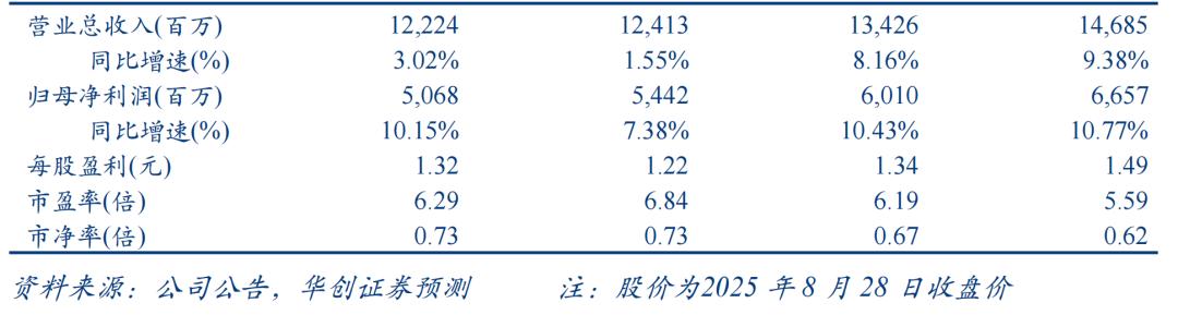 规模扩张及息差降幅收窄,营收提速;加大拨备计提,归母净利润增速保持在 6%左右。1)2Q25 净利息收入提速,其他非息降幅收窄,促使整体营收提速。2Q25 营收增速为+2.88%,增速环比+2.1pct。主要是由于量增价稳,单季净利息收入增速环比上升6.7pct至6.2%。并且单季其他非息收入降幅收窄7.4pct至-0.39%;2)成本有效管控,加大拨备计提力度,利润增速保持在6%左右。1H25归母净利润增速较Q1环比下降0.65pct至6.15%。主要是由于公司加大了非信贷拨备计提力度(不良贷款净生成率有所下降),信用减值损失同比增长14.4%。拨备覆盖率环比下降9pct至438%。成本有效管控,业务及管理费同比下降9.4%,2Q25成本收入同比下降3.7pct至30.5%。