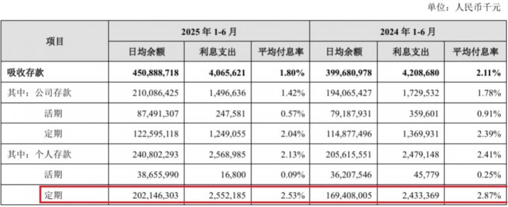2024 年,苏州银行的个人存款定期、活期日均余额之比扩大到 4.9 倍。苏州银行的个人活期存款日均余额不仅没增长,反而从 2023 年的 362.15 亿元下降为 2024 年的 359.77 亿元。与此同时定期个人存款日均余额却继续增长超 25%,达到 1767.13 亿元。进入 2025 年上半年,苏州银行的个人定期存款继续增长,达到活期存款的 5 倍以上。