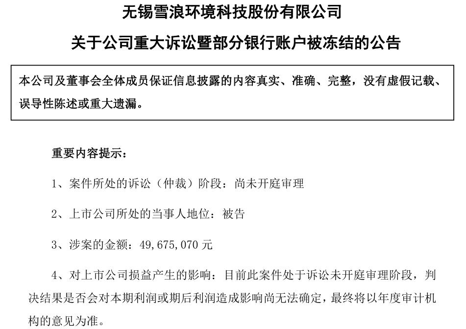根据 雪浪环境 12月3日晚间发布的公告,公司因金融借款合同纠纷被 苏州银行 无锡分行告上法庭。原告请求判令归还贷款本金及利息暂计4901.7万元,加上律师费等费用,涉案总金额接近5000万元。