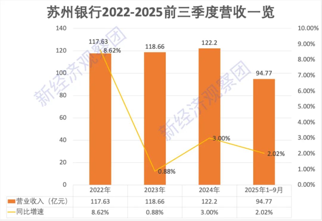 不过,根据该行披露的三季报,2025年1–9月,苏州银行实现营业收入94.77亿元,同比增长仅2.02%;归母净利润44.77亿元,同比增幅为7.12%,再度双双放缓。若以此节奏推算,全年利润增速恐将跌破10%关口,创下近五年新低。