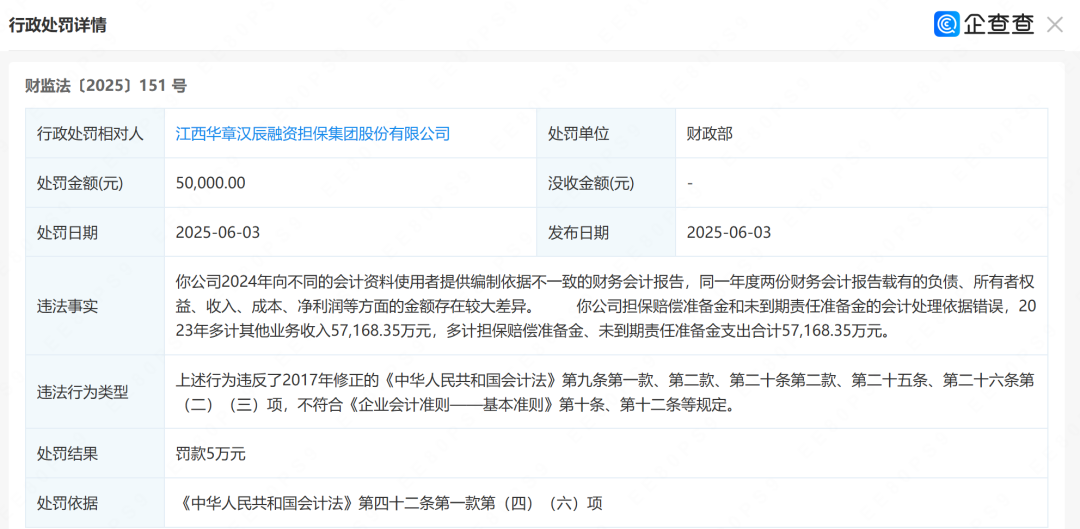 今年6月,华章汉辰融担因“2024年向不同的会计资料使用者提供编制依据不一致的财务会计报告,同一年度两份财务会计报告载有的负债、所有者权益、收入、成本、净利润等方面的金额存在较大差异”等问题被处罚5万元。