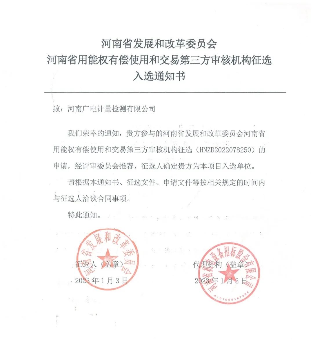 近日,河南省发改委发布了河南省用能权有偿使用和交易第三方审核机构征选结果。广电计量全资子公司河南广电计量检测有限公司(简称河南广电计量)成功入选,是公司在节能环保和“双碳”领域的又一突破,充分展现了公司的专业技术服务能力和综合实力。