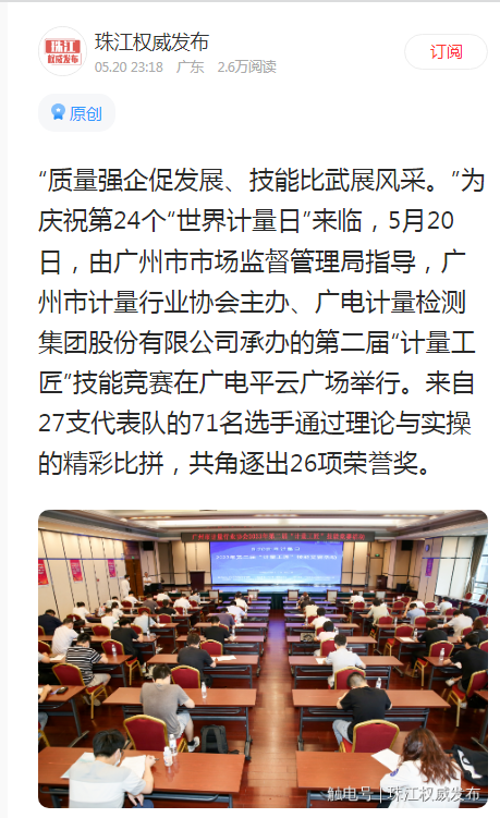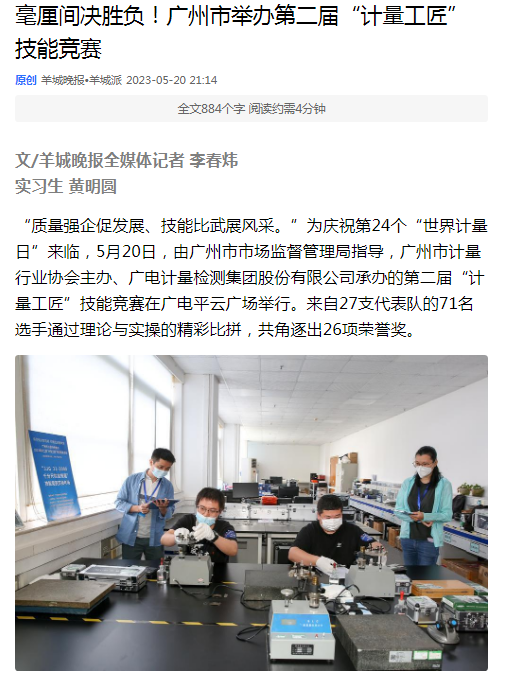 为贯彻落实习近平总书记对技能人才队伍建设的重要指示,弘扬劳模精神、劳动精神、工匠精神,激发广大计量技术人员的积极性、主动性和创造性,为计量行业的持续高质量发展提供有力的人才支撑,5月20日,由广州市市场监督管理局指导、广州市计量行业协会主办,广电计量检测集团股份有限公司(以下简称“广电计量”)承办的2023年第二届“计量工匠”计量检定人员竞赛在广电计量广州总部成功举办。吸引了来自广州市各区共27支代表队参加,70余名参赛选手进行角逐。