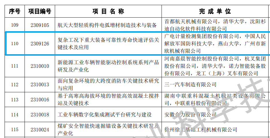 10月13日,2023年度“机械工业科学技术奖”名单公布。经中国机械工业联合会及中国机械工程学会评审,由广电计量检测集团股份有限公司、国防科技大学、燕山大学和广州市新欧机械有限公司联合开发的《复杂工况下重大装备可靠性寿命快速评估关键技术及应用》项目获评2023年度“机械工业科学技术奖”科技进步奖二等奖。