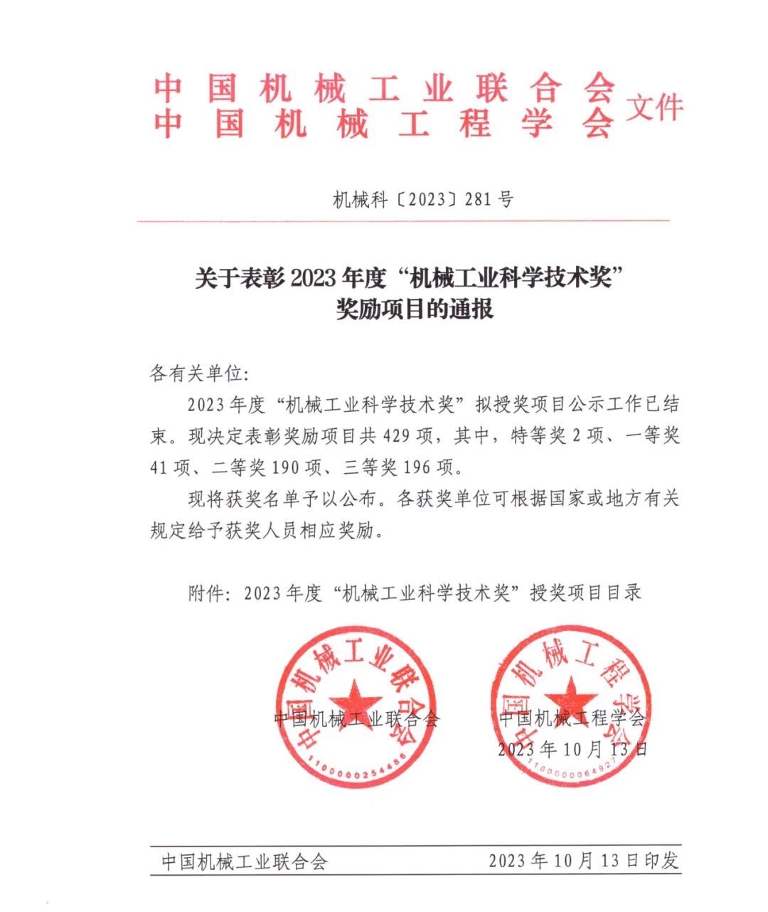 中国机械工业科学技术奖是根据《国家科学技术奖励条例》和《社会力量设立科学技术奖管理办法》的有关规定,由中国机械工业联合会和中国机械工程学会共同设立并经国家科学技术部批准,在国家科技奖励主管部门登记的面向全国机械行业的综合性科技奖项,也是机械工业申报国家科技进步奖的主要渠道。