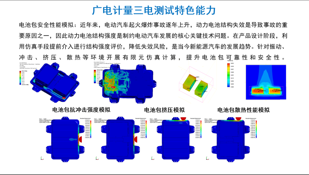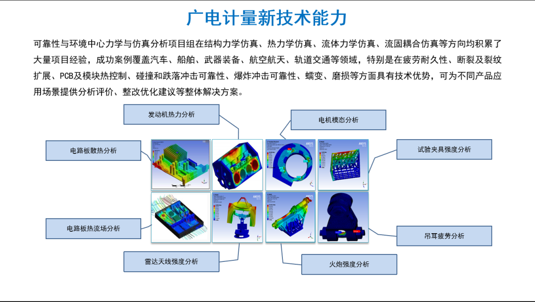 ●服务能力“软硬”结合,除了具备高端的测试设备,广电计量还可以基于结构力学仿真、热力学仿真、流体力学仿真、流固耦合仿真等进行仿真性模拟分析,更好地根据实际服务场景进行仿真模拟,减少测试成本及完善测试安排。
