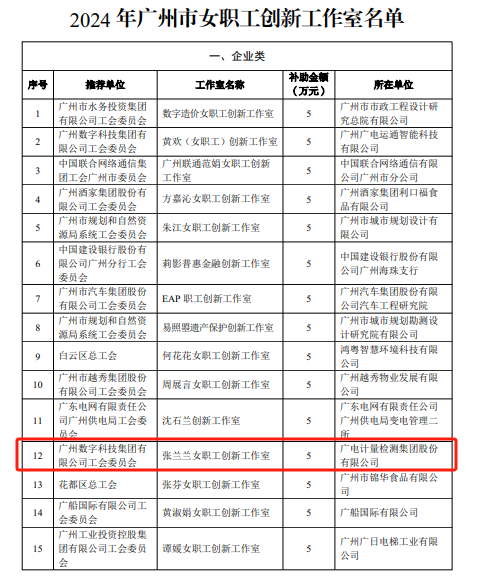 近日,在广州市总工会开展的女职工创新工作室创建评选工作中,广电计量检测集团股份有限公司“张兰兰女职工创新工作室”获得“2024年广州市女职工创新工作室”称号。