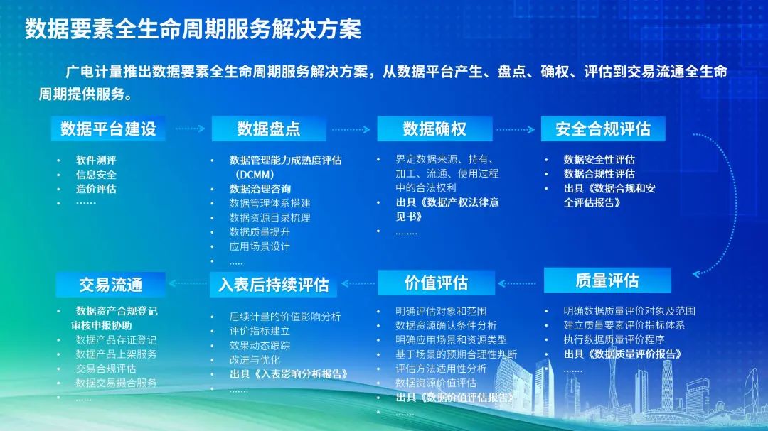 在对外服务方面,广电计量深耕数据管理和数据治理,始终聚焦于数据价值的产生与持久释放,将理论与实践相结合,积极推进数据资源入表落地。牵头编制《广州数据资产管理及入表工作指引》,牵头起草《数据资源控制及资产辨认的计量要求》,在此基础上构建了从数据盘点到交易流通的“全栈式”服务,服务涵盖数据治理咨询、数据管理能力成熟度评估(DCMM)、数据安全及合规评估、数据治理评价以及数据资产合规登记申报咨询等关键领域。