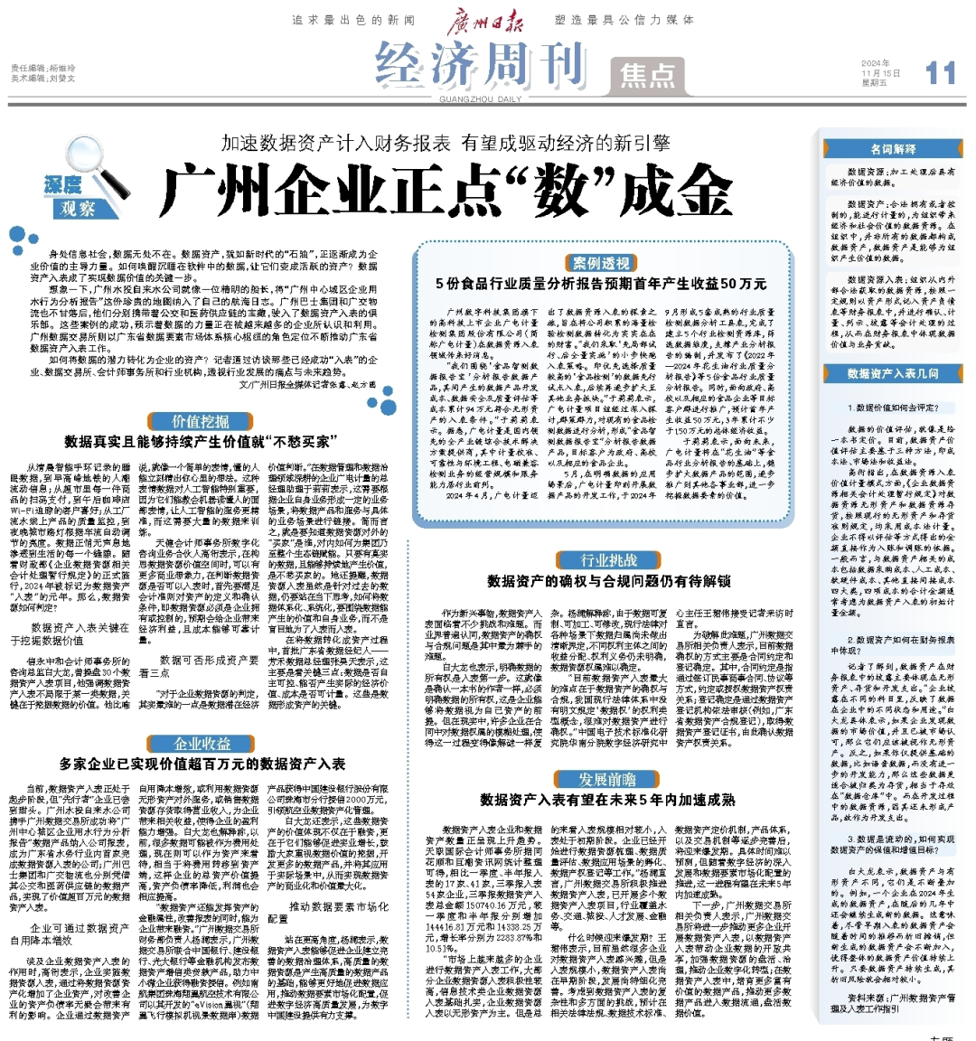 在数字经济蓬勃发展的浪潮下,数据资源入表成为企业实现数字化转型和挖掘数据价值的关键环节。在数字经济领域,广电计量“内外兼修”展现出了卓越的实力和影响力,广州日报于《广州企业正点“数”成金》报道上展现了广电计量在数据资源入表领域的部分成果。