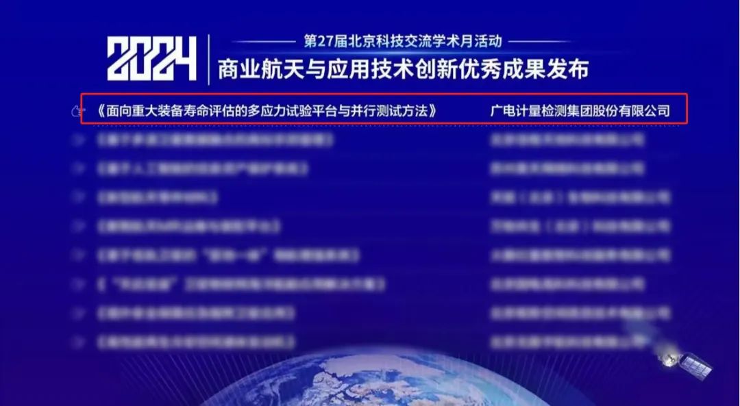 11月20日,第二十七届北京科技交流学术月-2024商业航天与应用技术创新学术交流会暨优秀成果发布会在北京召开。会议正式发布了“2024商业航天与应用技术创新优秀成果”并现场颁证,广电计量研究项目《面向重大装备寿命评估的多应力试验平台与并行测试方法》成功入选。
