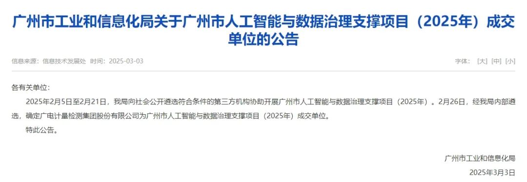 3月3日,广州市工业和信息化局发布《关于广州市人工智能与数据治理支撑项目(2025年)成交单位的公告》,广电计量成功中标该项目,后续将为广州企业提升人工智能与数据治理水平提供技术支撑。