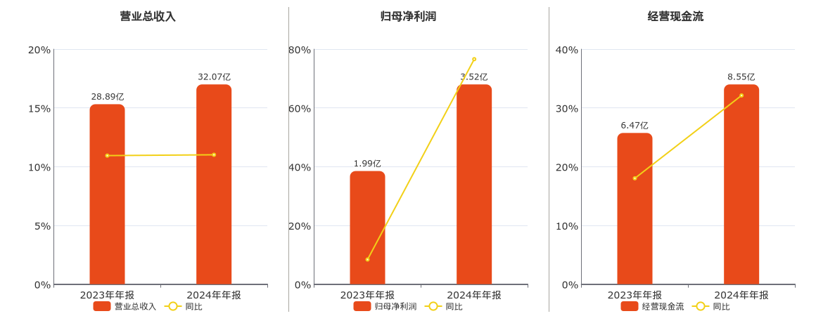 公司营业总收入为32.07亿元,较去年同报告期营业总收入增加3.18亿元,实现5年连续上涨,同比较去年同期上涨11.01%。归母净利润为3.52亿元,较去年同报告期归母净利润增加1.53亿元,实现3年连续上涨,同比较去年同期上涨76.59%。经营活动现金净流入为8.55亿元,较去年同报告期经营活动现金净流入增加2.08亿元,实现5年连续上涨,同比较去年同期上涨32.12%。