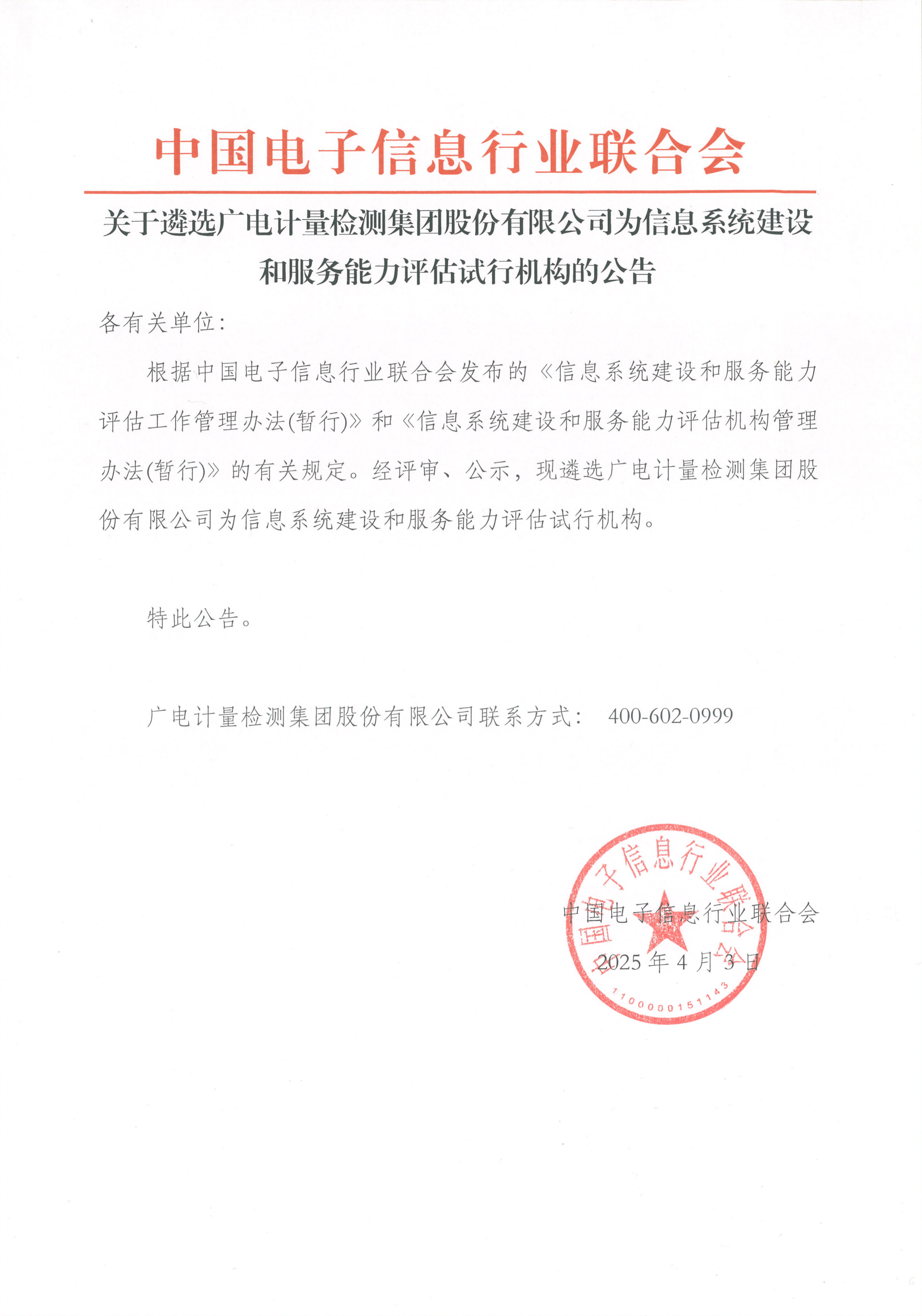近日,根据中国电子信息行业联合会发布的公示,广电计量检测集团股份有限公司成功入选为信息系统建设和服务能力(CS)评估机构,体现了行业权威机构对广电计量评估服务能力的认可,为公司后续在相关领域进一步拓展业务、树立行业标杆奠定了坚实基础。