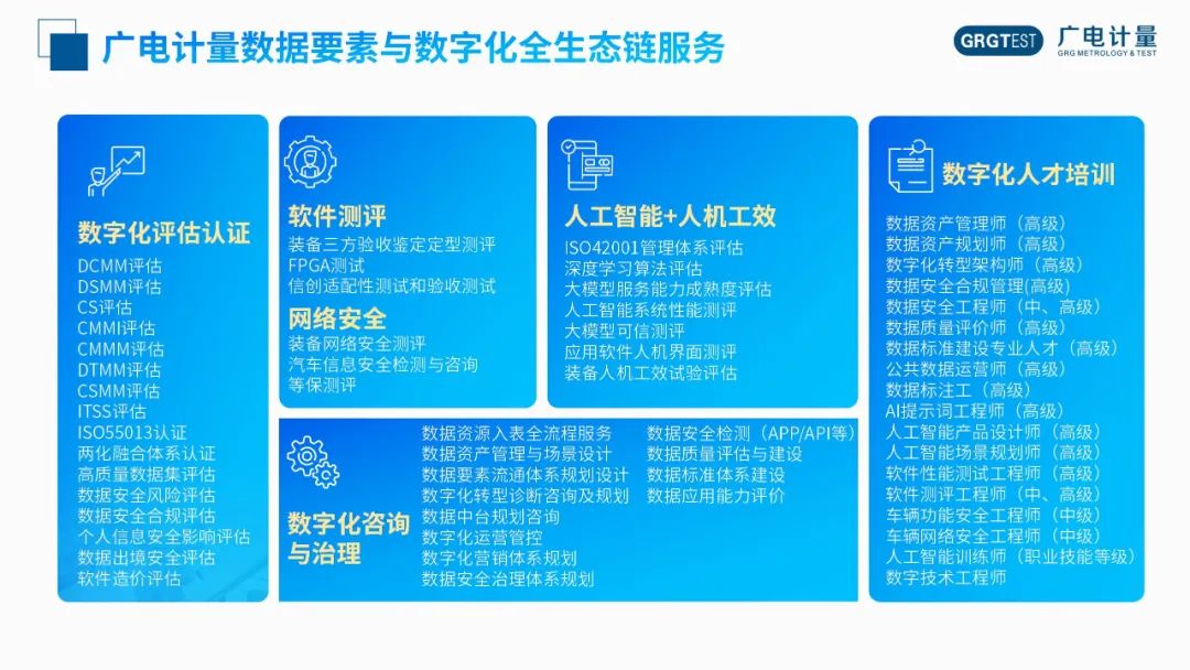 广电计量作为“全栈式”数字化转型及数据要素服务提供商,是中国电子信息行业联合会指定DCMM评估机构,已为500余家客户提供DCMM、数字化转型咨询、数据治理、数据安全、数据资源入表、人工智能算法验证测评以及数字化人才培育服务。未来,广电计量将继续坚守检验检测认证质量管理体系,不断拓展信息化服务高端资质,持续迭代提升团队的测评技术相关能力,为航空、汽车、电力等国家战略性新兴产业及广大政府部门、机关单位、企业客户,提供DCMM、CMMM、DSMM、CMMI、ITSS、CSMM、CS、CCRC、两化融合、数字化转型等评估认证服务,以及软件测评、信息安全、软件造价评估、人工智能、人机工效、人才培训以及科研等“一站式”技术服务,助力产业数字化转型,支撑“数字中国”建设。