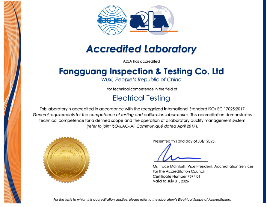 A2LA是国际实验室认可合作组织(ILAC)的重要成员,其认可资质在全球范围内具有高度公信力。此次资质的取得,不仅体现了方广检测在检测技术、质量管理及国际化服务方面的卓越能力,更意味着其出具的检测报告将获得美国、欧盟、亚太等全球多个经济体的广泛认可,显著降低企业产品出口的重复检测成本,助力客户高效开拓国际市场。