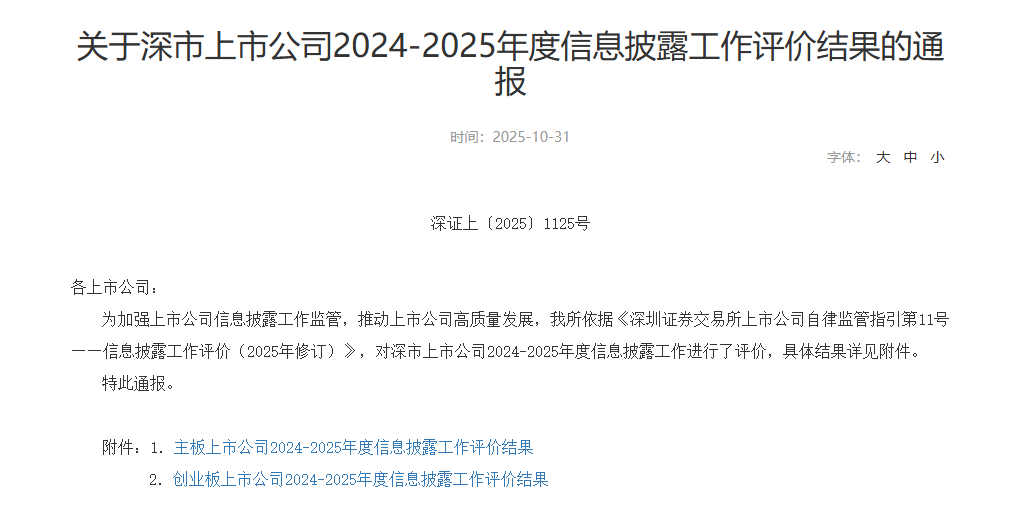 近日,深圳证券交易所通报了深市上市公司2024-2025年度信息披露工作评价结果。广电计量(股票代码:002967.SZ)再次荣获A级评价,体现了监管机构对公司在规范运作、公司治理及投资者关系管理的优异表现的高度肯定。根据深交所2024-2025年度信息披露工作评价结果显示,深市参评的2841家上市公司中,评价结果为A的公司仅523家,占比18.41%。
