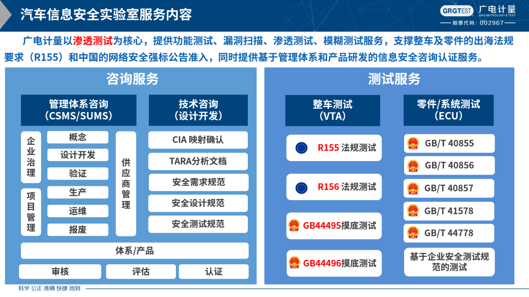 ●在汽车信息安全领域,是国家技术标准创新基地(汽车)信息安全标准应用数据库共建单位,建有汽车信息安全实验室,以渗透测试为核心,提供整车(适配 GB 44495、UN R155 等)与零部件/系统(符合多项国标及企业规范)的信息安全测试服务,同时开展覆盖汽车信息安全管理体系(CSMS/SUMS)及产品研发全生命周期的技术服务,助力整车及零部件高效满足国家新规与欧盟法规准入要求。