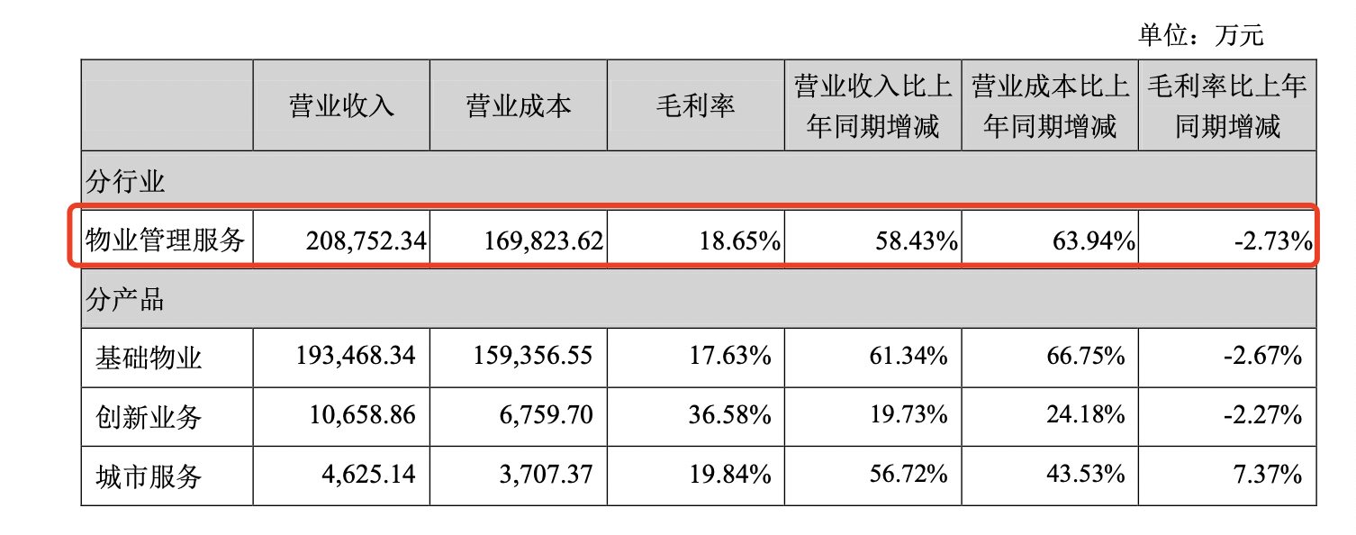 报告期内,新大正的物业管理服务营收20.88亿元,同比增长58.43%,占营业收入的99.96%。不过,该项营业成本16.98亿元,同比增长63.94%;毛利率降2.73%至18.65%。