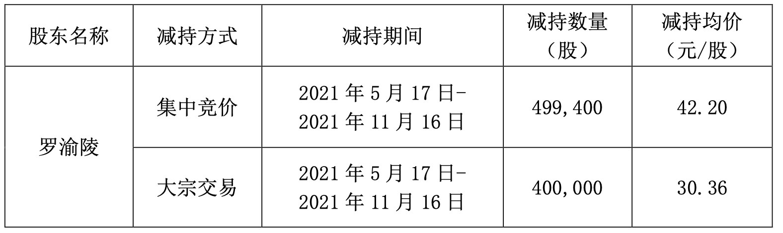 最终,罗渝陵在此次减持期间合计减持了89.94万股股份。其中,以集中竞价减持了49.94万股,减持均价42.20元/股;以大宗交易方式减持了40万股,减持均价30.36元/股。据此计算,这次减持,罗渝陵合计套现了约2240.59万元。