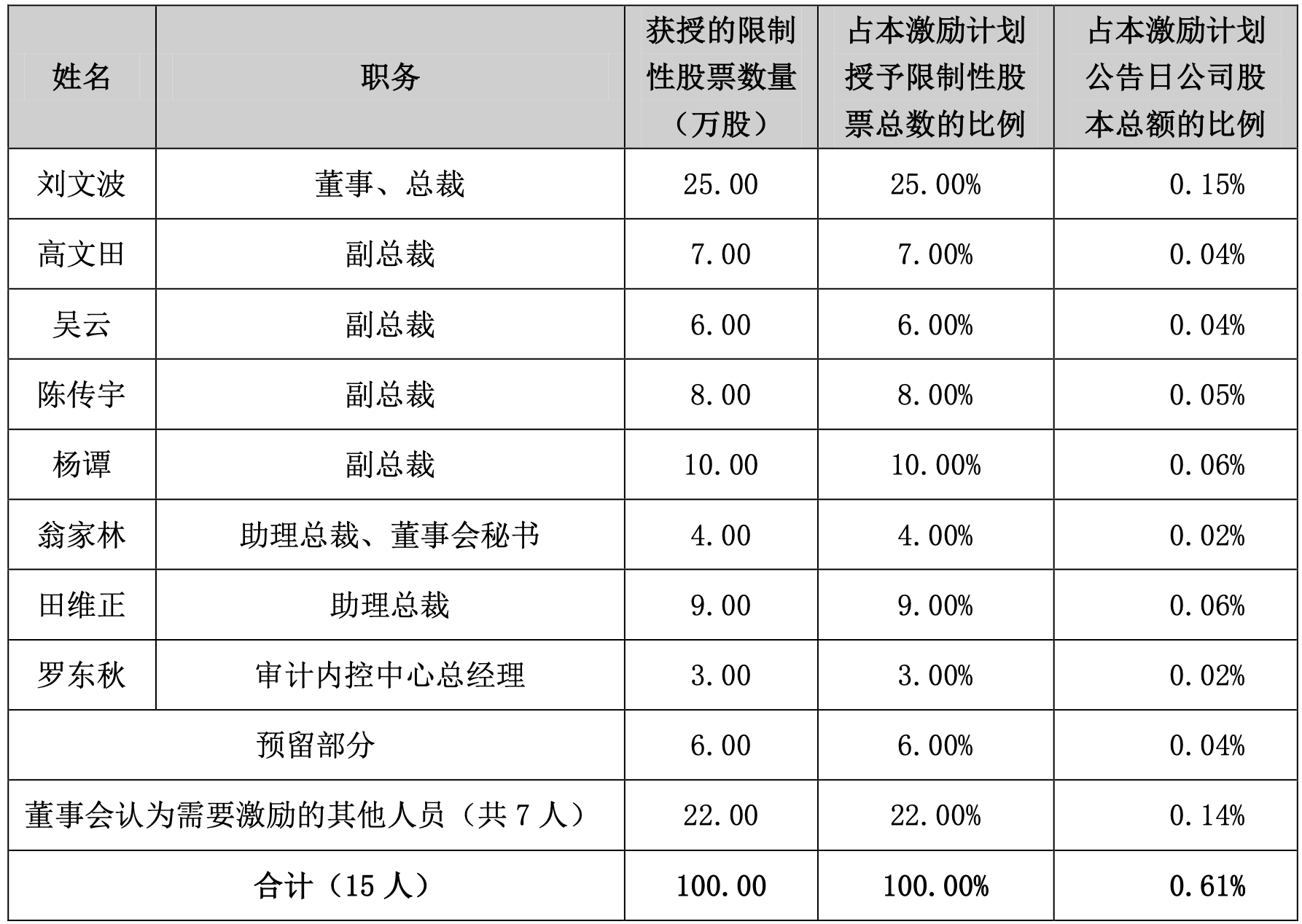 万限制性股票,激励包括董事、高管、中层及骨干人员等17人。其中,约有30万股为预留股,暂不配授。