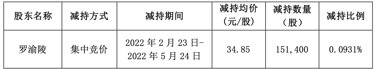 公告显示,在今年2月23日至5月24日期间,罗渝陵以集中竞价交易方式减持公司股份15.14万股,占公司普通股总股本比例为0.0931%,本次减持均价为34.85元/股。