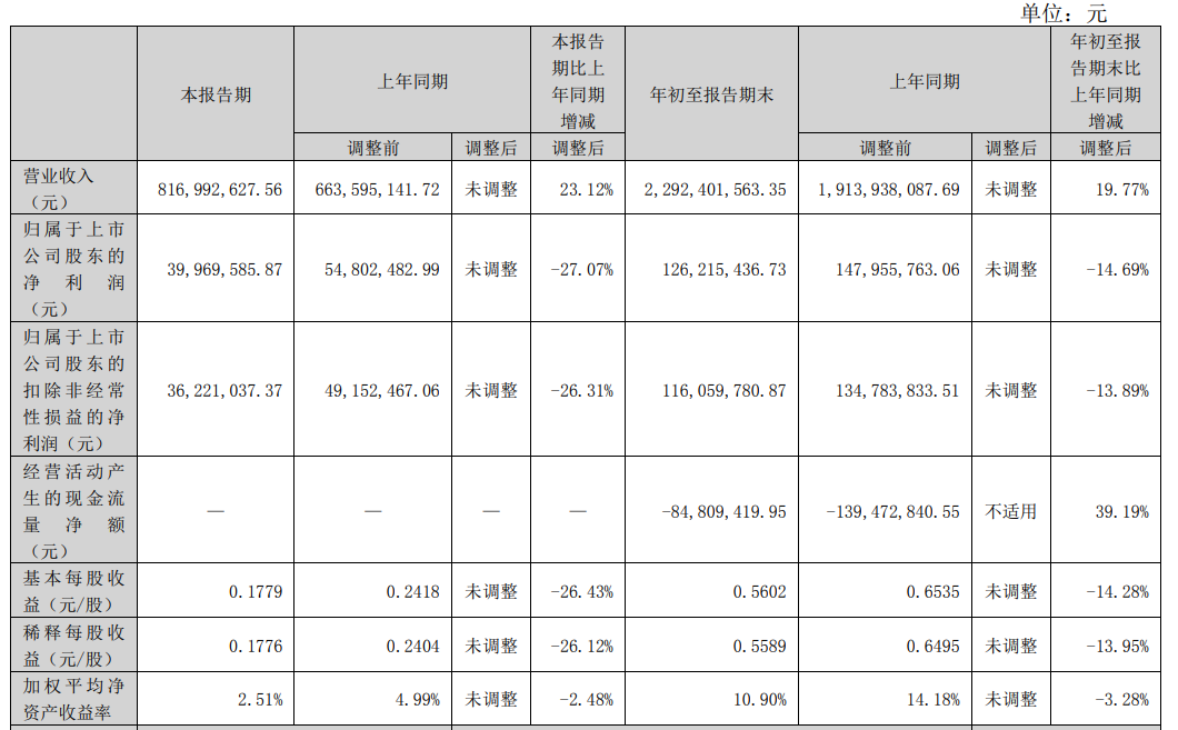 2023年第三季度,新大正营业收入8.17亿元,同比增23.12%;归属于上市公司股东的净利润3996.96万元,同比降27.07%。