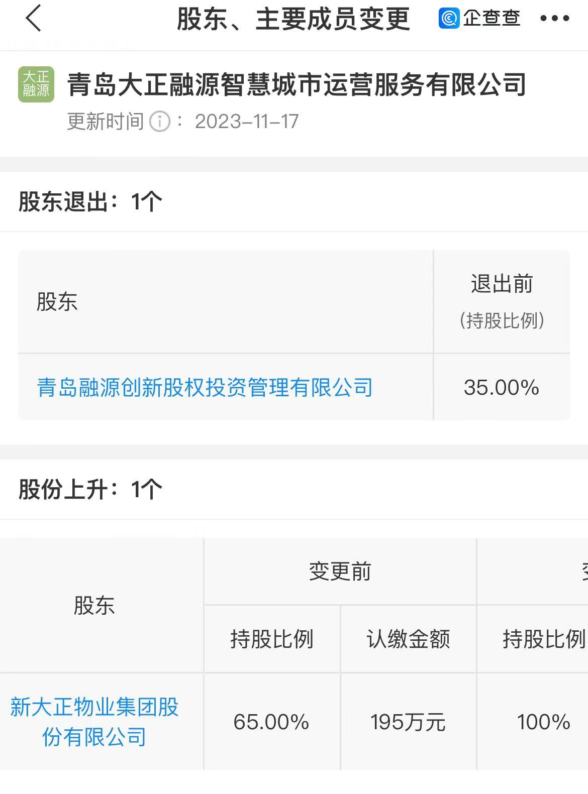 股权变更前,青岛大正融源智慧城市运营服务的大股东为新大正,持股65%;融源创新持股35%。股权变更后,其由新大正100%持股。