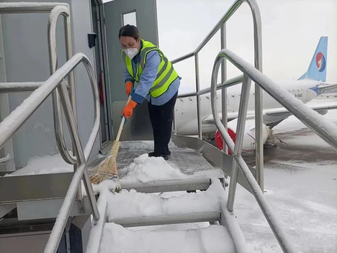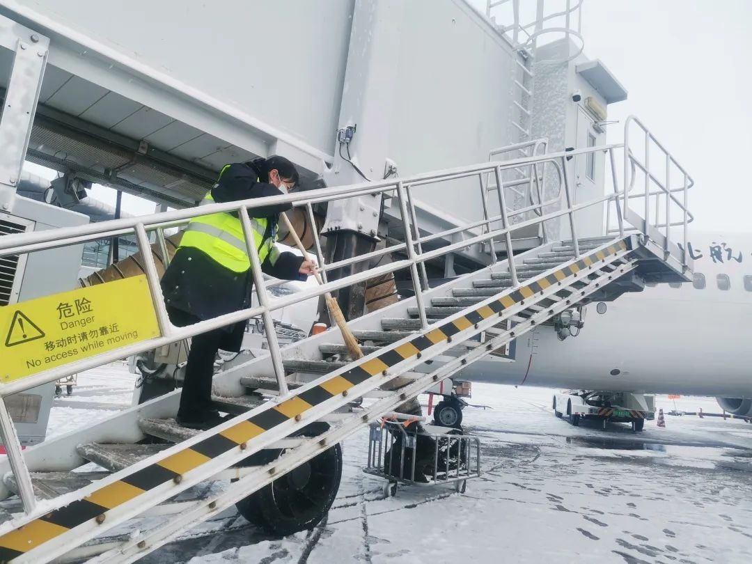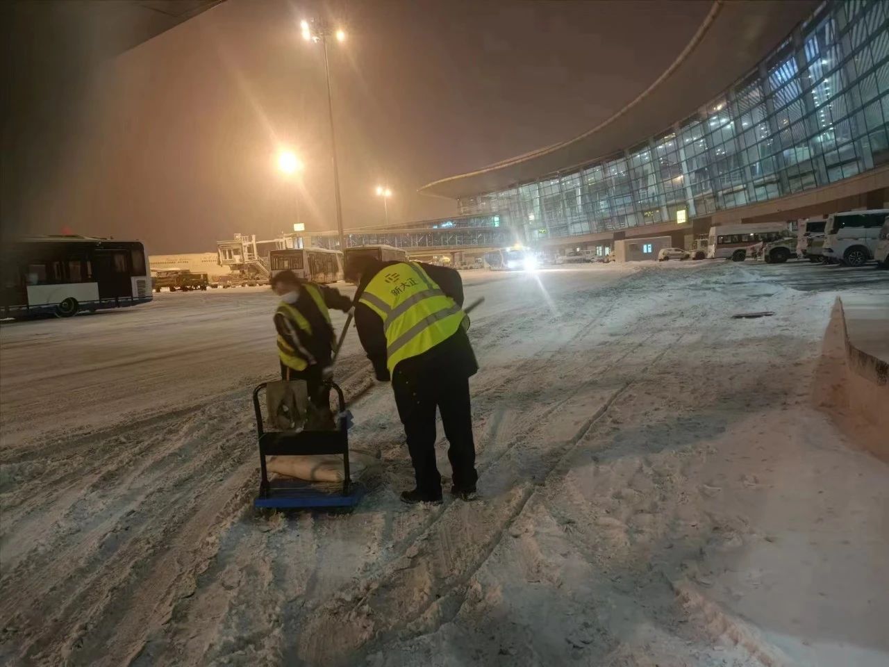 12月13日凌晨起,石家庄遇连续大雪天气,为保障航班的正常运行和旅客的出行安全,石家庄正定国际机场项目立即启动冰雪天气应急预案,近30名物业人员连夜到岗开展除冰扫雪行动。零下17℃的天气里,大家分工合作,扫雪、铺防滑地垫、设置隔离带、撒融雪剂、放置安全警示牌、专人引导旅客注意地滑,经过近3个小时奋战,在第一波旅客到达前将所有落客平台及廊桥旋梯积雪全部清扫干净。大雪下了3天,这批员工就坚守奋战了3天,数轮清扫“作战”,时刻保障着旅客们的顺利出行。