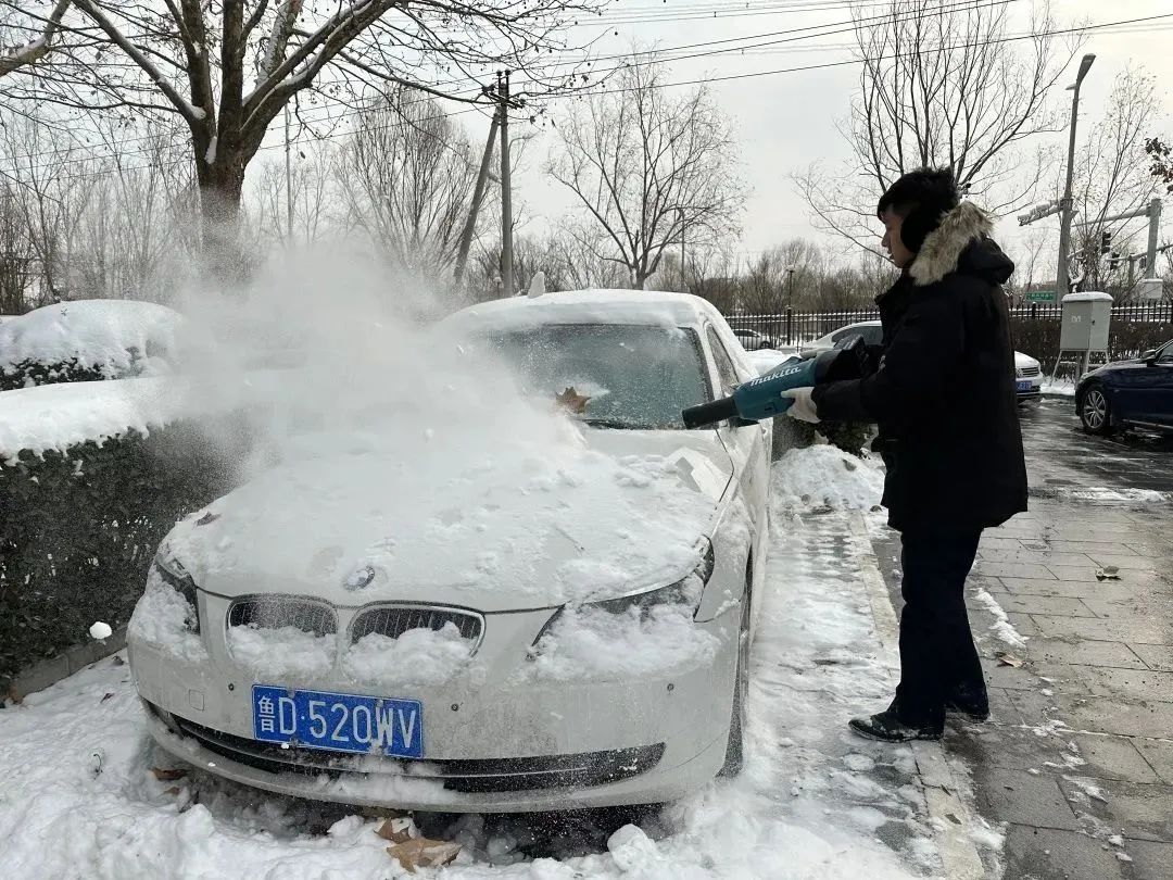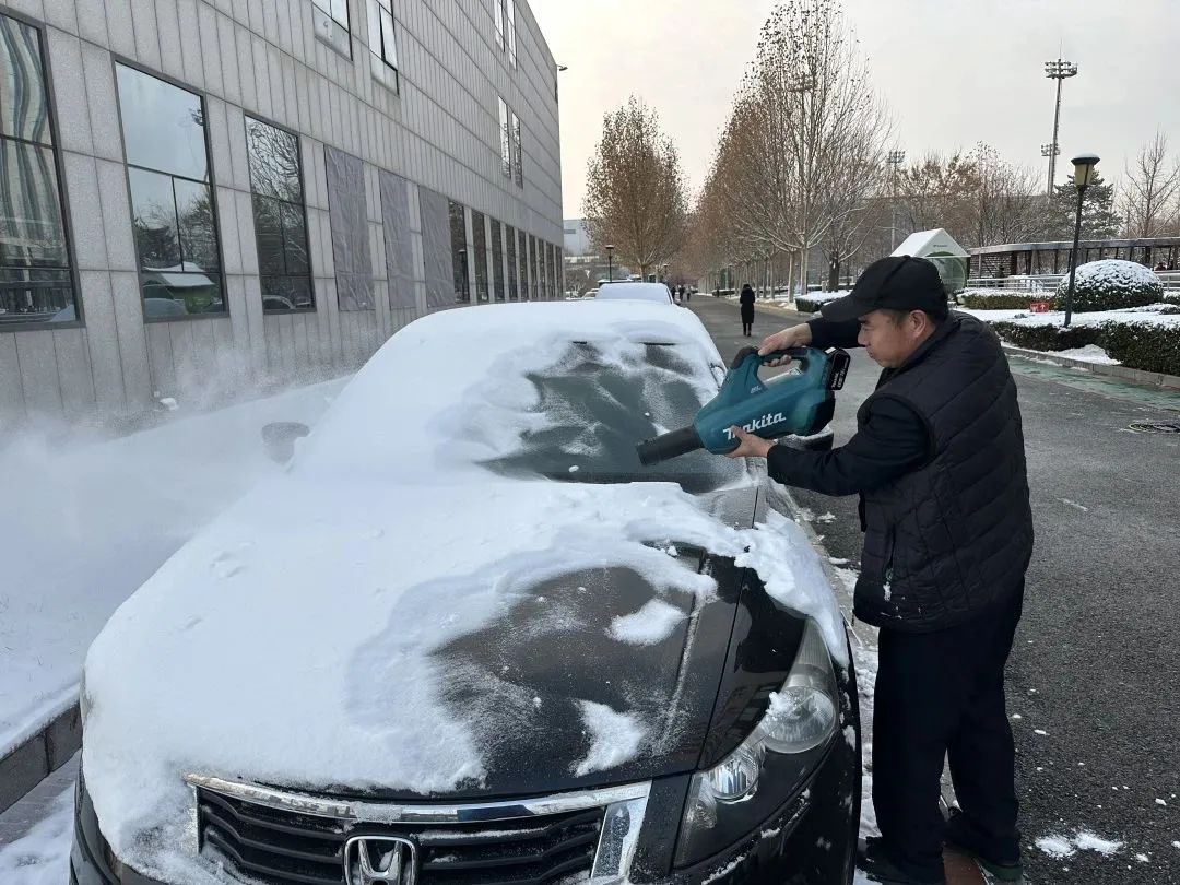 在北京金风科技园区项目,物业人员在大规模清除地面积雪的同时,还安排专人利用强力吹雪机等专业设备,自发为客户清除车辆穿上的厚厚“雪衣”,防止上冻结冰,也避免了因车辆积雪而引发的交通安全隐患,收获了客户的高度赞誉。