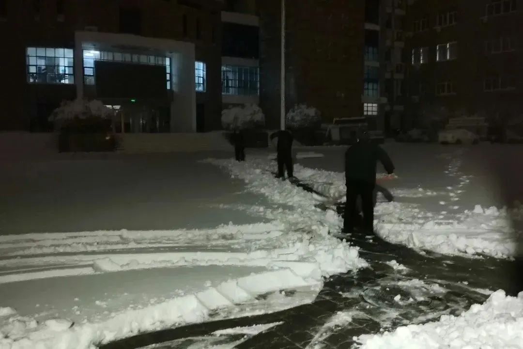 早上6:20,北京的天还未亮,国家开放大学项目团队已经全员到齐,顶着风雪投入到了清雪工作中。大家利用除雪铲、扫把、融雪剂等工具,对外围广场、车库进出坡道、人行道进行重点清理。寒冷的天气没有影响大家的热情,个个干劲十足,忙碌的身影构成了一道靓丽的风景线。
