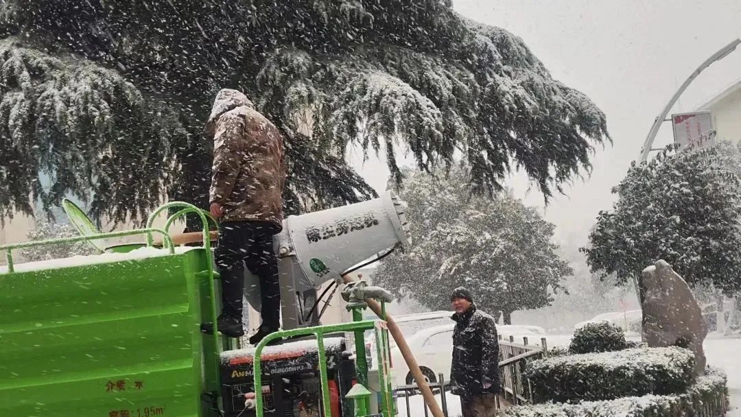 济南营区项目员工冒雪清扫,并利用除尘雾炮机辅助作业