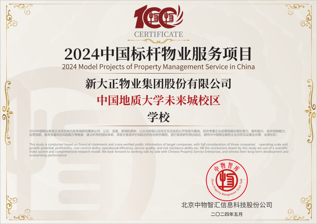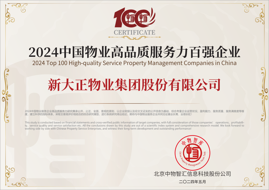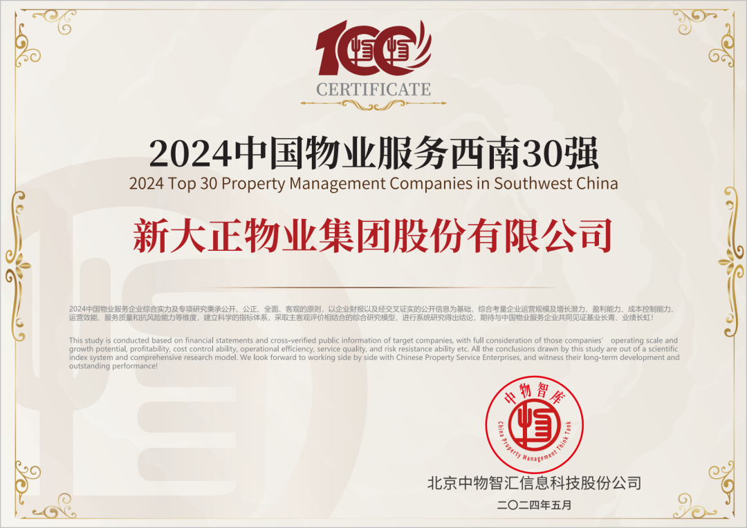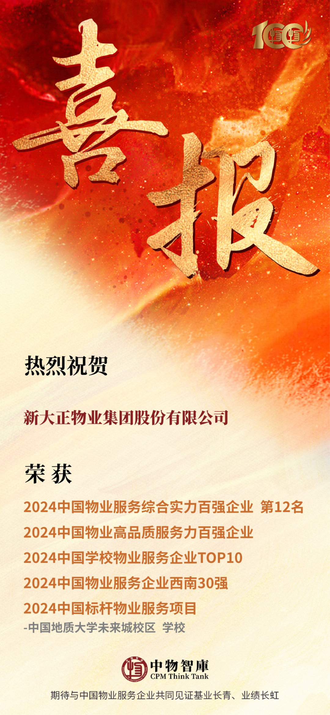 会上,发布《2024中国物业百强企业研究报告》,同期重磅发布“2024中国物业服务综合实力百强企业”“2024中国物业高品质服务力百强企业”及系列专项榜单。新大正以优秀的市场表现和服务能力,荣获“2024中国物业服务综合实力百强企业”第12名、“2024中国物业高品质服务力百强企业”、“2024中国学校物业服务企业TOP10”、“2024中国物业服务企业西南30强”、“2024中国标杆物业服务项目-中国地质大学未来城校区”奖项。