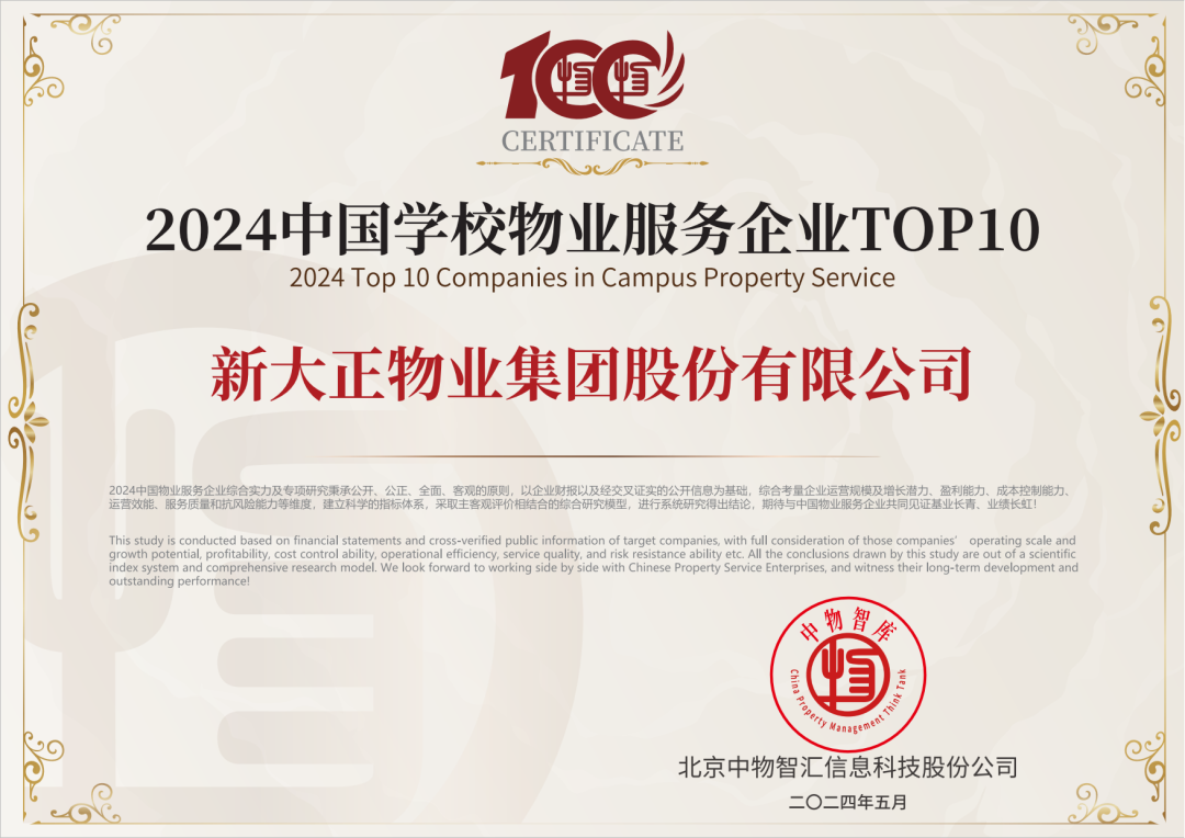 此次,新大正荣获学校细分业态服务企业TOP10,彰显了行业对公司学校物业服务实力的再次认可。新大正坚持用“标准化、专业化、智慧化”的服务打造美好校园,以独有的“全流程”学校物业服务链及针对师生的特色教辅服务,打造校园“贴心大管家”的全方位物业服务体系,全方位满足师生的多元化、多层次、人性化的育人需求。迄今,已为全国近100所学校提供后勤一体化服务,如山东大学、西安交通大学、广西大学、中国地质大学、重庆大学等全国重点院校。2023年11 月,新大正当选中国教育后勤协会理事单位,进一步提升了公司在教育后勤行业的影响力和知名度。