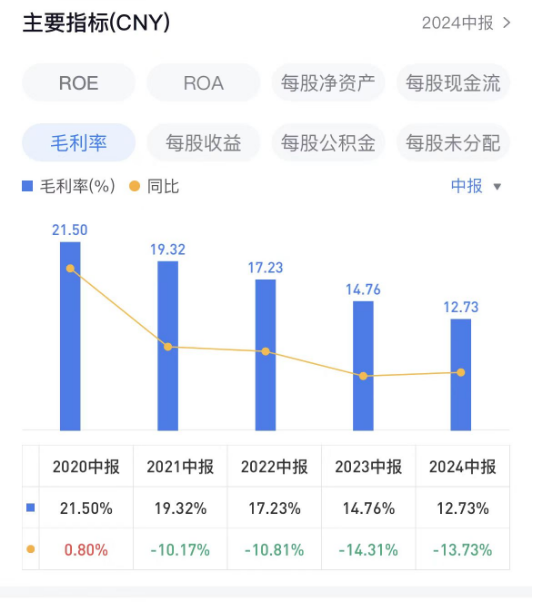 新大正毛利率四连降。2020上半年至2024上半年,新大正毛利率分别为21.5%、19.32%、17.23%、14.76%、12.73%。