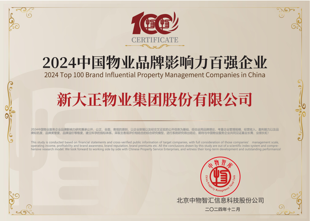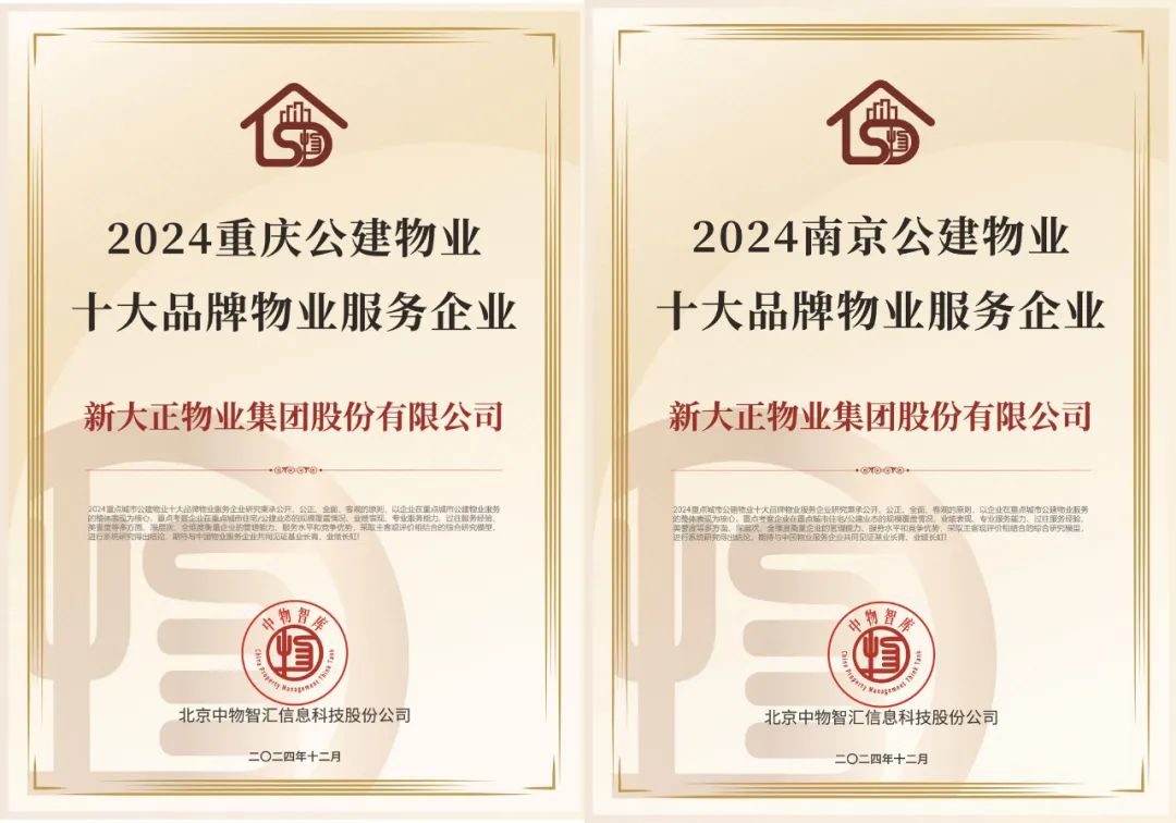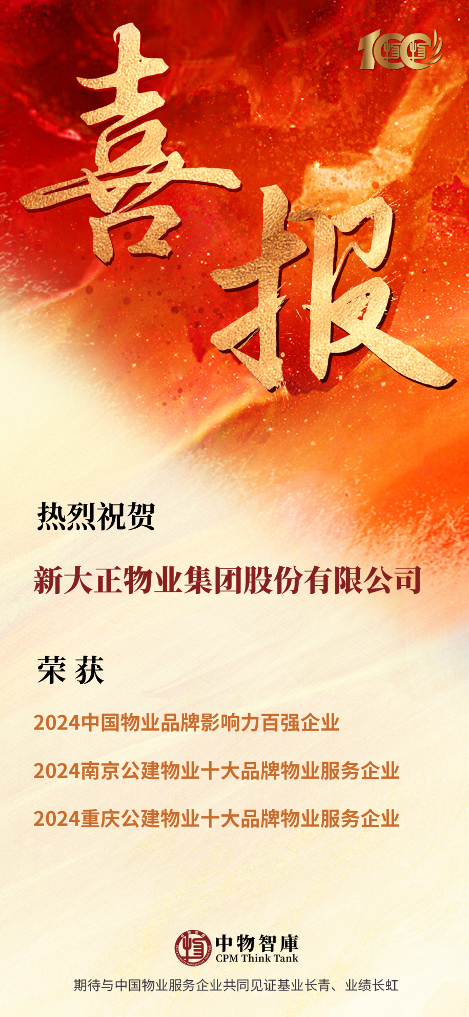 其中,新大正物业集团股份有限公司(以下简称新大正)荣获“2024中国物业品牌影响力百强企业”以及“2024南京公建物业十大品牌物业服务企业”和“2024重庆公建物业十大品牌物业服务企业”奖项。