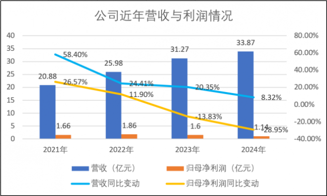 虽然公司营收有所增长,但期内录得归属于上市公司股东的净利润仅为1.14亿元,同比减少28.95%;归属于上市公司股东的扣除非经常性损益的净利润为1.07亿元,同比下降22.79%,即便是在还原2023年度股份支付853万元回冲的影响后,降幅仍高达17.77%。